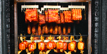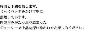 桜のチップで12時間いぶすことにより風味と保存性を高めます。チップのくべ加減が絶妙な燻煙の香りをのせる匠の技です。